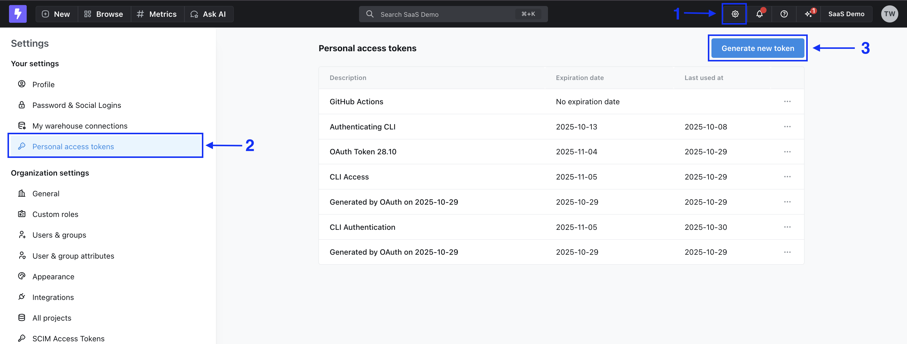 If you use single sign-on (SSO) in the browser, login with a personal access token.First, create a new personal access token in the UI by going to Settings > Personal Access Tokens.