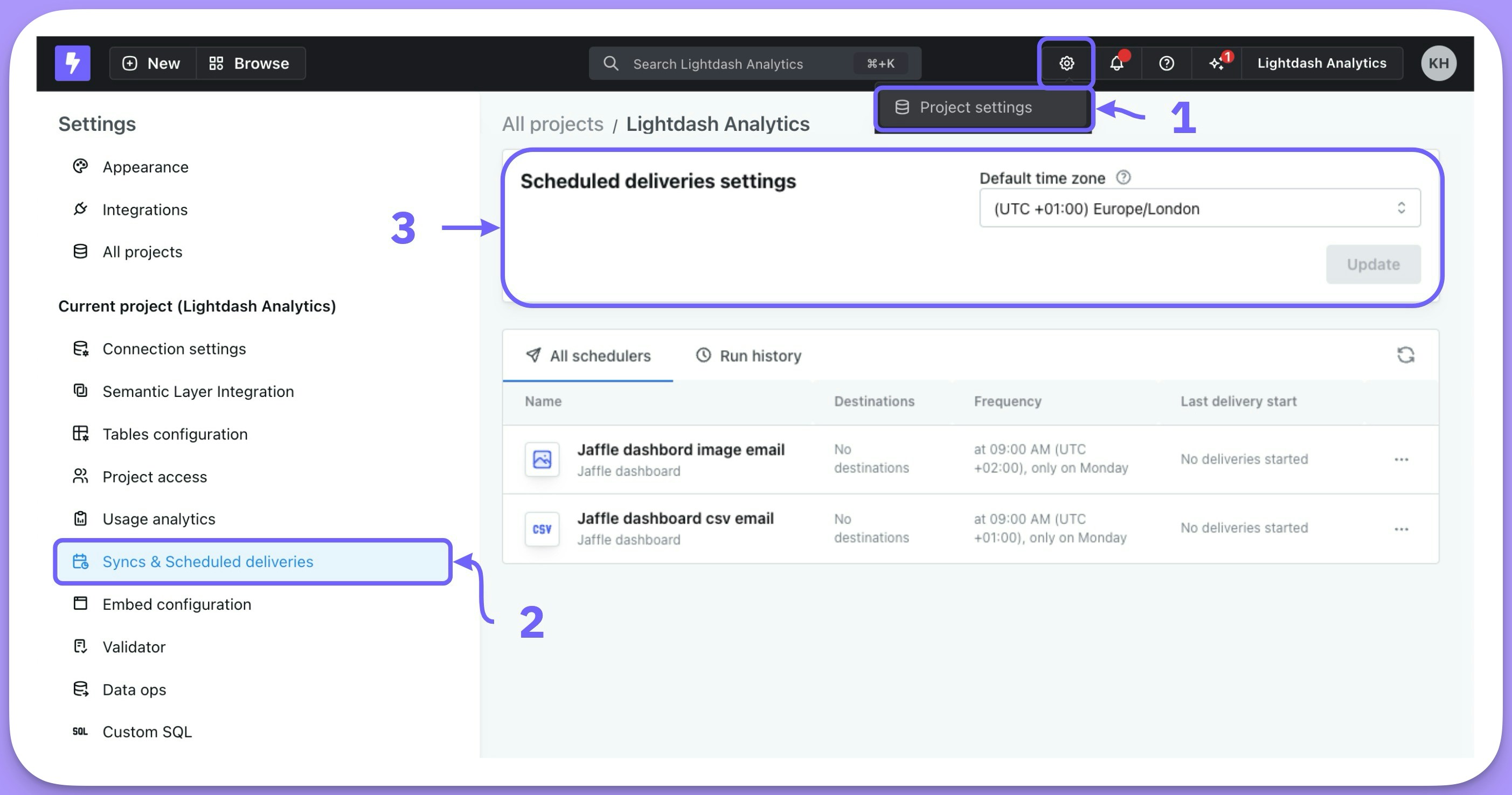 Project admins can set the default time zone used for scheduled deliveries across the project in theProject settings —> Syncs & Scheduled deliveries.