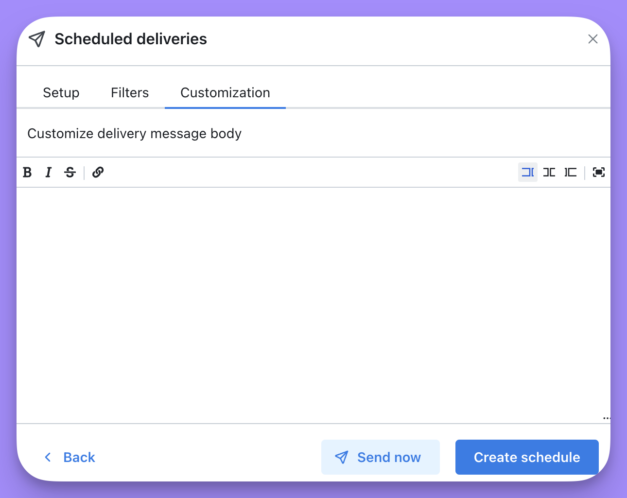 Finally, you can customize the message that gets sent with your scheduled delivery on theCustomization tab.