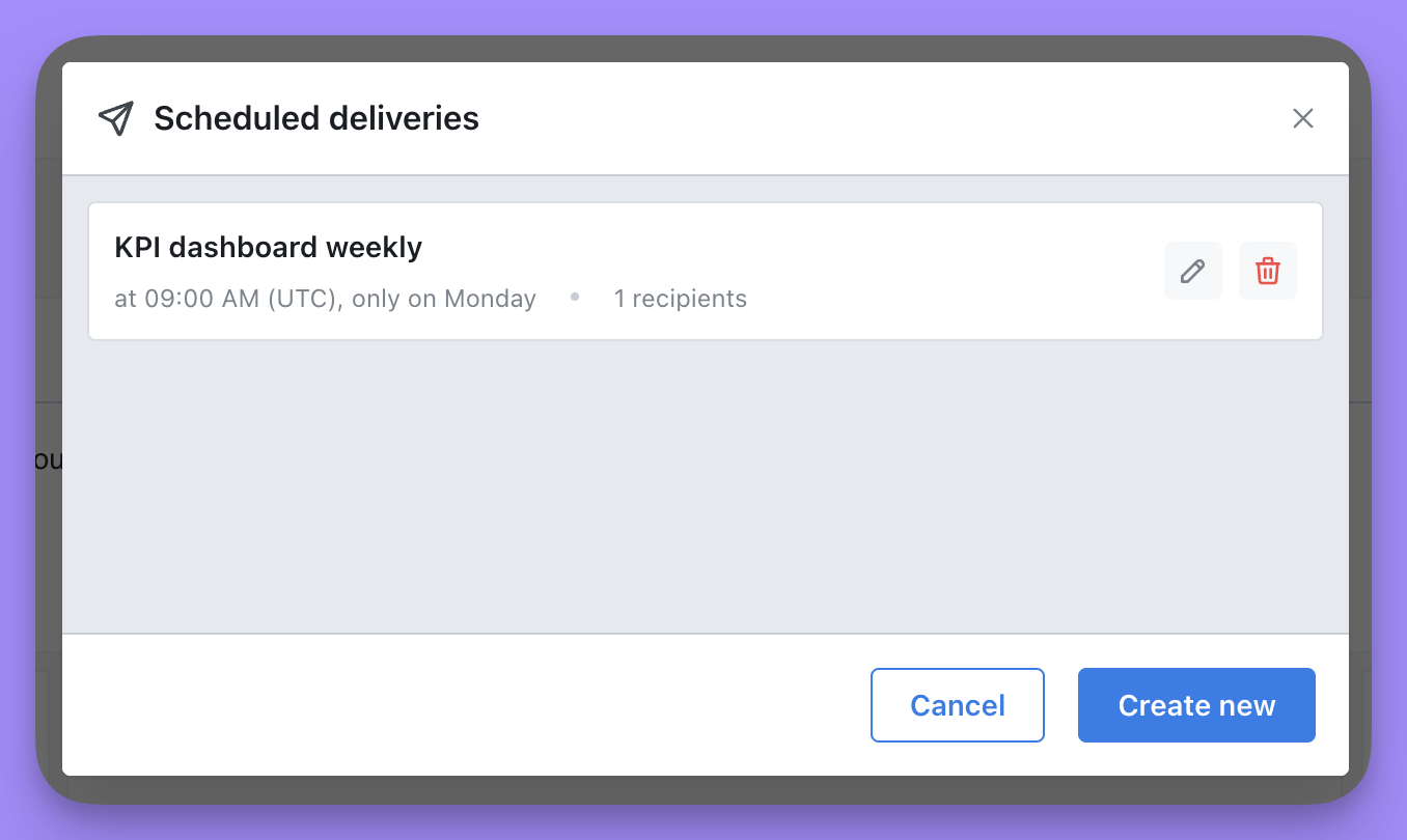 To edit a scheduled delivery, click on the pencil-icon next to the scheduled delivery you want to edit. This will bring you back to the configuration screen for your scheduled delivery, where you can make any changes you’d like. In case you want to delete a scheduled delivery, click on the trash-icon next to the scheduled delivery you want to delete.